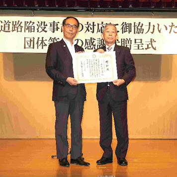 埼玉県は、八潮市で発生した道路陥没事故の復旧作業に関して、8月27日午前10時30分からコルソホールで、団体等への感謝状贈呈式を開催した。当協会から小川会長らが出席し、大野知事から感謝状を受け取った。